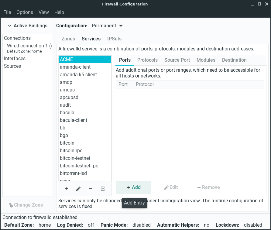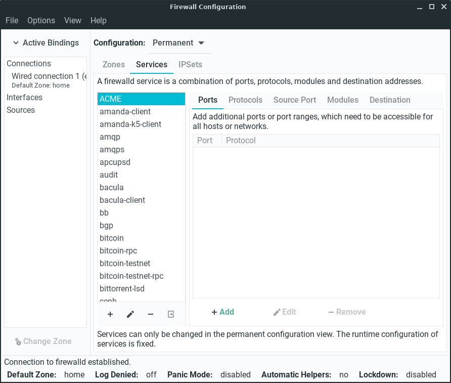 Port 6860 has now been added. The server admin should now remove port 22 by selecting it and clicking on the -Remove button. Click on Options, Reload Firewalld to activate our new firewall rule, enter your password if prompted.