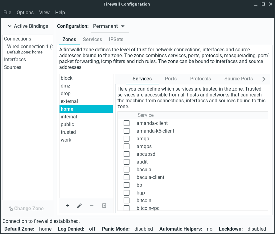 sudo firewall-cmd --stateWith the Firewall enabled, Linux Lite let's through the everyday traffic by default, for example, internet and mail. If you want for example to use DropBox, you will need to make sure it has been ticked in the Services tab, and the relevant ports have been added. Torrent applications and their accompanying ports will also need to be ticked and added to function properly.