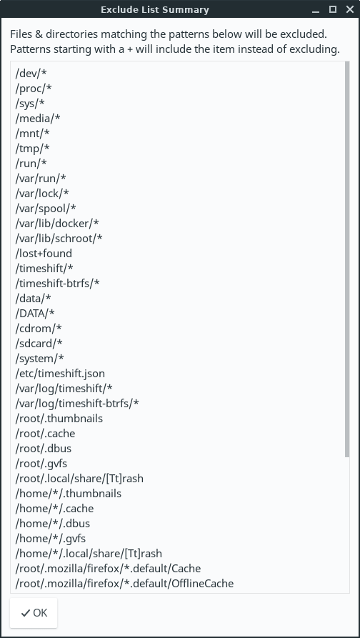 You can also specify Filters to include or exclude files or directories from the snapshots. Timeshift is designed to protect system files and settings. User data such as documents, pictures and music are excluded by default. This prevents you from overwriting your documents when you restore a snapshot or using all of your storage to backup media (pictures, music, and video) files. We recommend you use the Backups application in the Accessories menu for your home folder backups, and use Timeshift for system backups, the choice is yours.