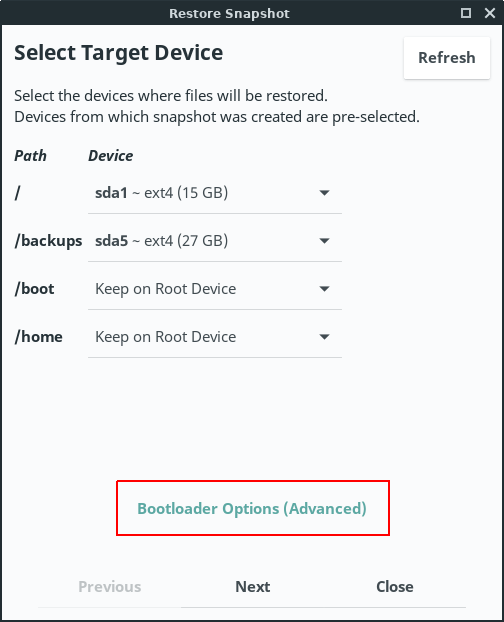 Next you will select your target device where files will be restored. You will have to specify your root device and whether or not to keep the boot and home files on the root device or on another partition.