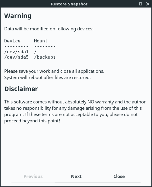 Timeshift is a system restore tool for Linux. It provides functionality that is quite similar to the System Restore feature in Windows or the Time Machine tool in MacOS. Timeshift protects your system by making incremental snapshots of the file system manually or at regular automated intervals.