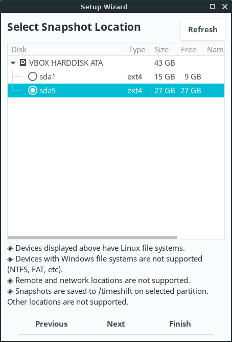 The next thing to do is select your snapshot location. You can choose to have your snapshots on your local disk or on an external storage device. Wherever you choose, make sure you have at least 100Gb plus of spare storage. An external hard drive is an wise choice. In the following example, sda5 is our backup location, sda1 is our Linux Lite partition. Click on the Next button.