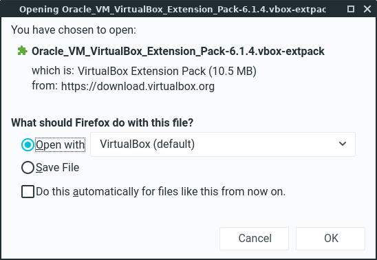 You need to know the version number of your VirtualBox installation in order to download the matching "Extension Pack". In this example, our version is 6.1.4; but double-check that by clicking Help, About VirtualBox from the main VirtualBox window. Then look along bottom of pop-up window for the version number.