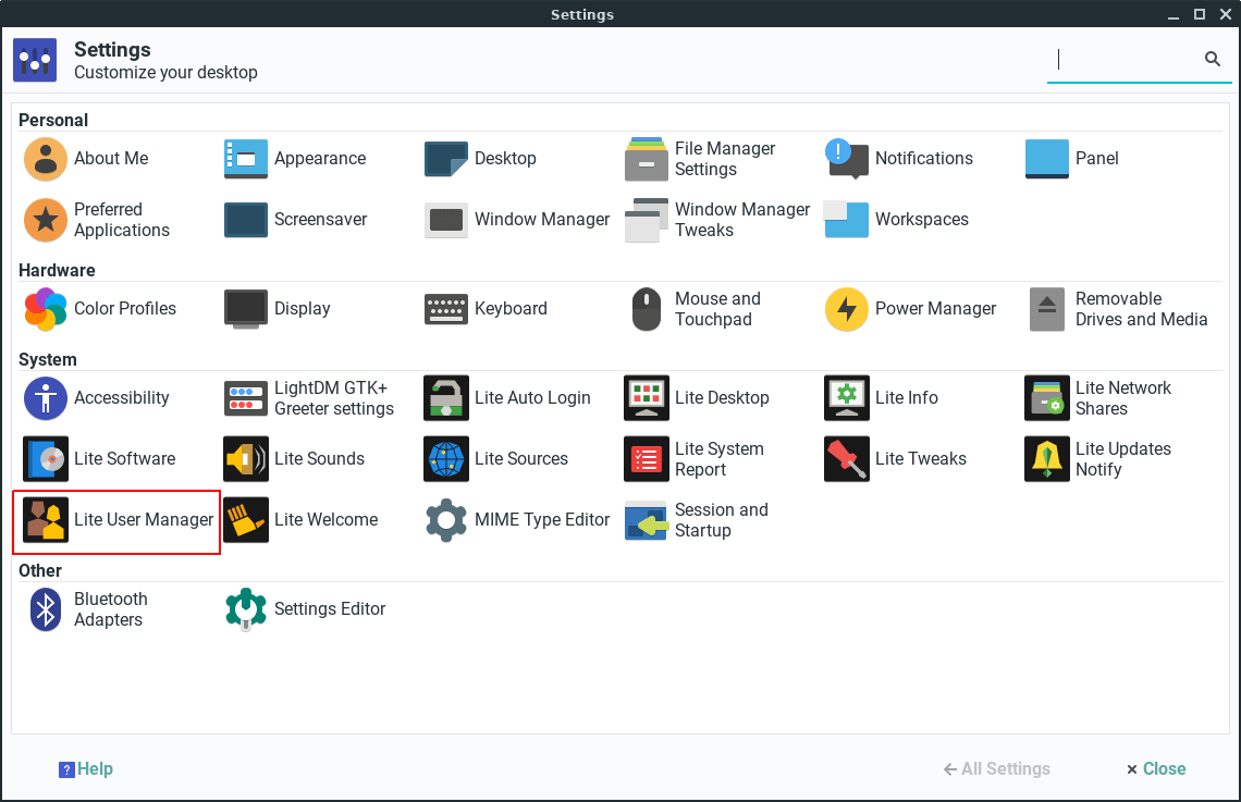 Open the Linux Lite (not VirtualBox) Settings Manager, Menu, Settings, Settings Manager and select the Lite User Manager.